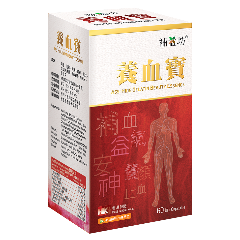 補益坊 養血寶 本品主要成分為阿膠,加入熟地黃、黨參、黃芪、枸杞子相互配合,具有「補血、補氣、滋陰、固表」的作用。熟地黃能滋陰補血,改善血虛所致的面色蒼白、頭暈心悸;黨參補中益氣,增強脾胃功能,促進營養吸收;黃芪有固表止汗、提升免疫力的作用,能幫助抵抗外邪;枸杞子則養肝明目,改善眼睛乾澀及疲勞,並有助延緩衰老。既能補氣生血,又能滋陰養陽,達到陰陽平衡、氣血充盈的效果。特別適合體質虛弱、經常疲倦、需要全面調理的群體,讓身體在日常生活中保持穩定而持久的活力。